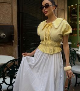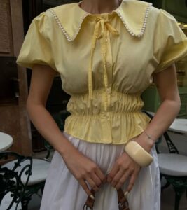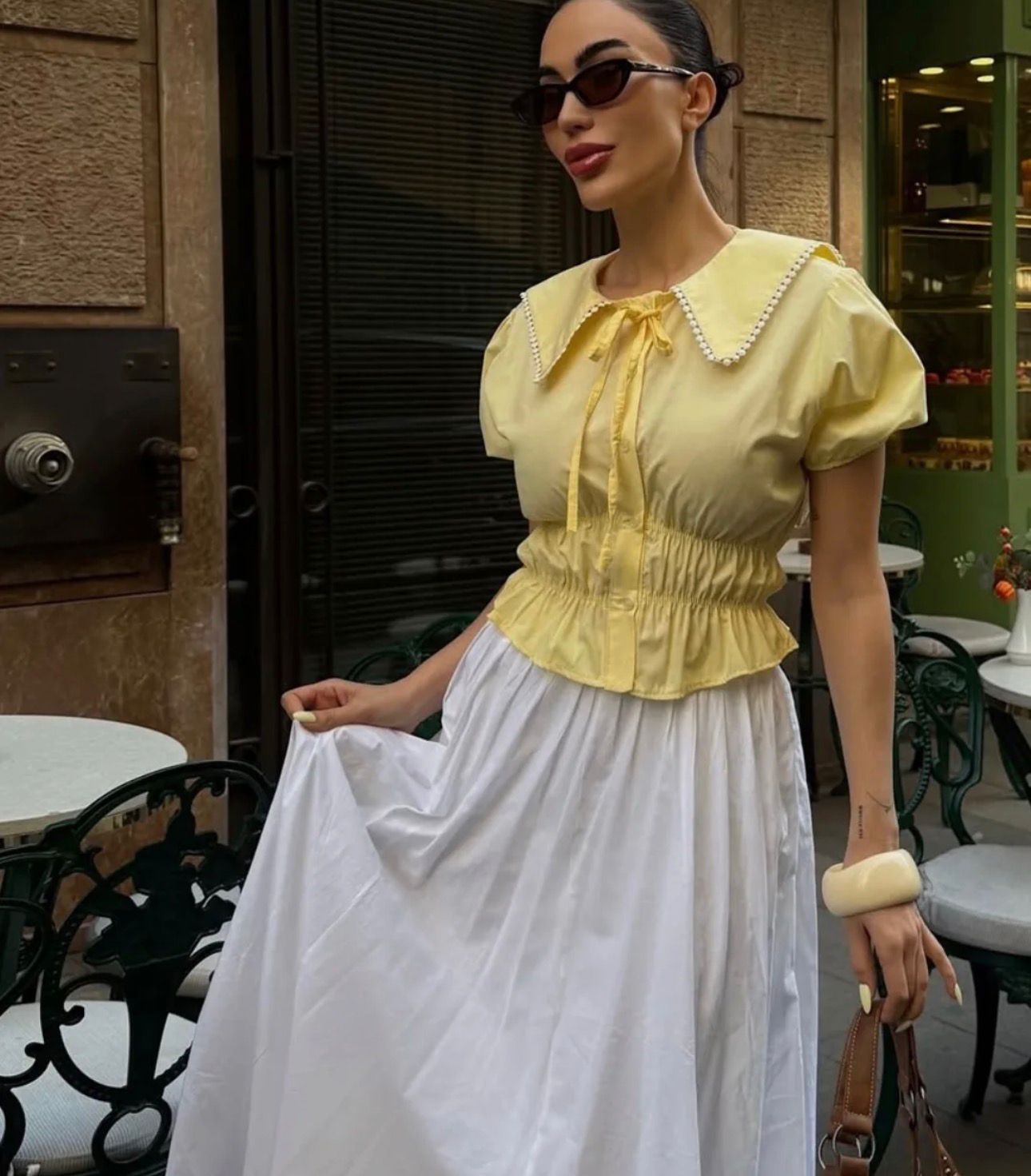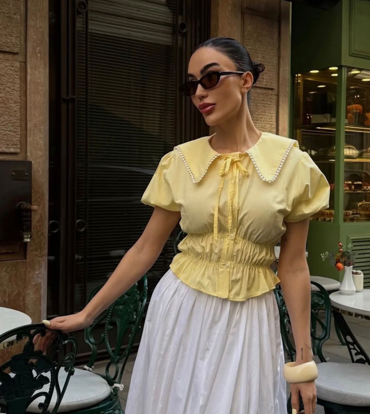 Şık ve zarif tasarımıyla öne çıkan bu sarı gömlek, yaz aylarının vazgeçilmez parçalarından! İnci detaylı yakası ve pileli kesimiyle feminen bir stil sunan gömlek, rahatlığıyla günlük kullanım için ideal. Özel aksesuarlarla tamamlanarak şık bir görünüm kazandırabilirsiniz. Malzeme: %100 Pamuk Bedenler: S, M, L (Mağazamızda farklı beden ve çeşitler mevcut) Fiyat: 400 TL Not: Ürün stoklarla sınırlıdır.…